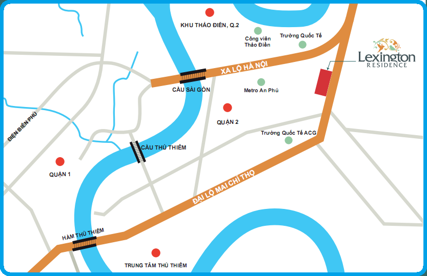 Căn hộ Lexington Residence có vị trí đắc địa tại khu đô thị City Horse Quận 2. Tọa lạc tại mặt tiền Đại lộ Mai Chí Thọ, Từ Lexington Residence, cư dân có thể đi chuyển qua các quận trung tâm một cách dễ dàng: Quận 1, 3, 4, 7, 9, Bình Thạnh, Thủ Đức…