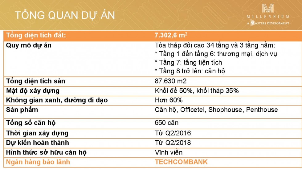 Căn hộ Millennium 132 Bến Vân Đồn vừa chọn được tên gọi chính thức là Millennium – Masteri giống như M-One – Masteri thay vì tên cũ TheEverRich8. Dự án này được phát triển bởi Phát Đạt Corporation , Vinh Hội Investment và đặc biệt là Thảo Điền Investment – đơn vị đã tạo ra thương hiệu Masteri đẳng cấp. Căn hộ Millennium thể hiện đảng cấp ngang hàng với những căn hộ cao cấp nhất tại quận 1, căn hộ quận 1 giá quận 4